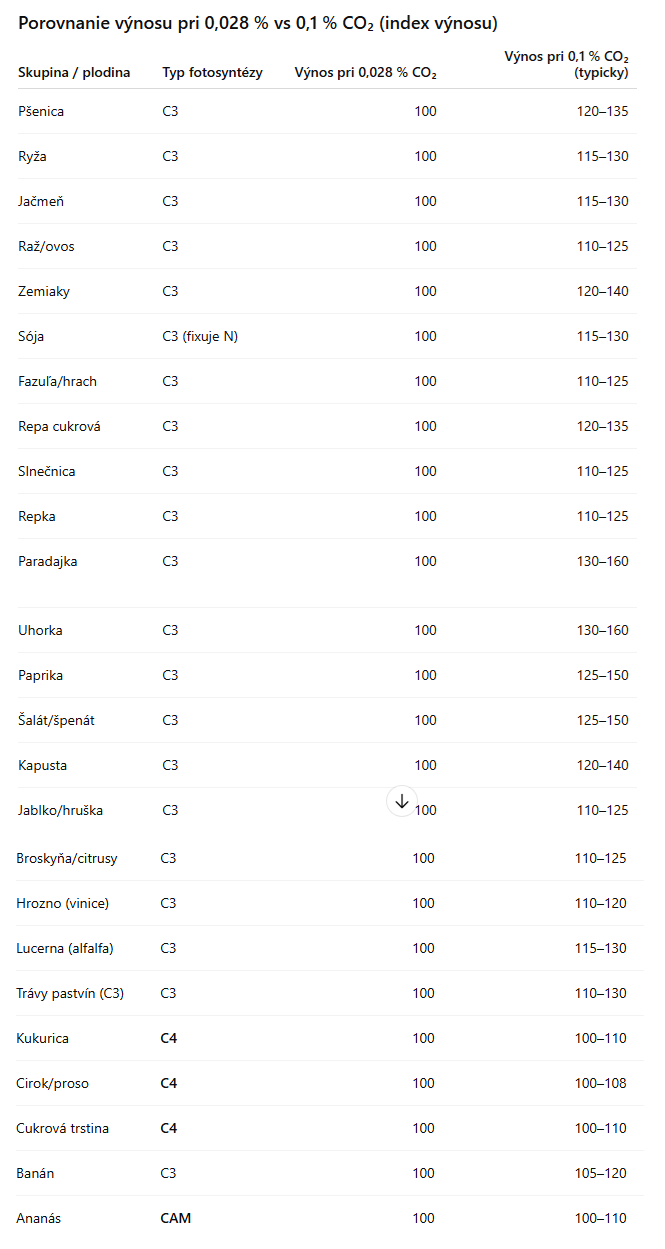 Ako vidíme z tabuľky, pri zvyšovaní CO2 v ovzduší, pokiaľ zostanú iné podmienky nezmienené, má CO2 hnojivý efekt. Koncentrácia 0,1% CO2, čo bude hodnota v roku 2100 ak s emisiami nespravíme nič, dokáže zvyšovať úrodu o 10-60% v závislosti od druhu plodiny, v porovnaní s množstvom CO2 0,028%, čo je hodnota za ktorú lobujú eko aktivisti.