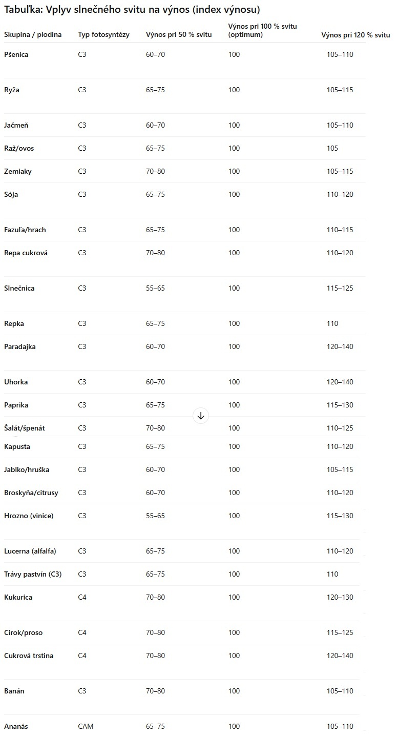 Ako vidíme z tabuľky, zvyšovanie slnečného svitu zvyšuje úrodu o 5-40%. Otepľovanie vplýva na zvyšovanie slnečných dní. Otepľovanie spôsobuje to, že je menej pravidelnosti. Dakedy pršalo 10 dní do mesiaca, tak že 10 mierných dáždivých dní. Teraz pri otepľovaní síce naprší rovnako veľa, cca rovnaký objem, ale mení sa intenzita. Už neprší 10 dní do mesiaca, ale len 5 dní do mesiaca ale silno. 5 dní silných lejákov sú ekvivalentom 10 dní s miernym dážďom. Čiže keď dakedy bolo v mesiaci 10 dáždivých dní 20 slnečných, dnes je len 5 dáždivých dní a 25 slnečných. Stúpa počet slnečných dní, hoci zrážky sú +- rovnaké, len sa mení intenzita.